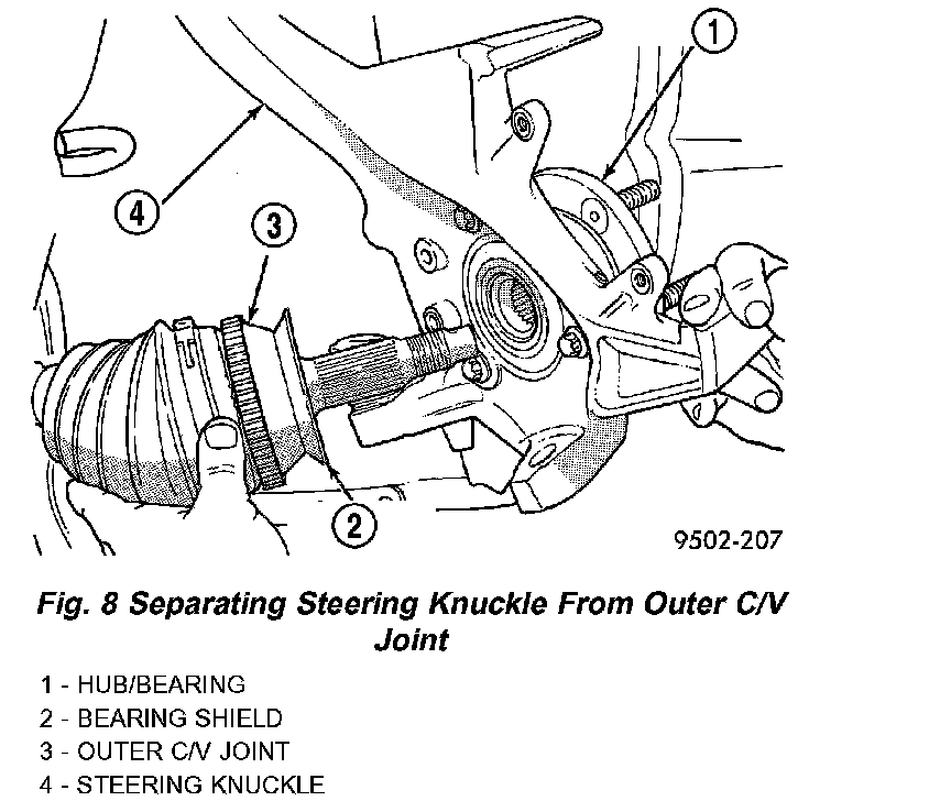 11. Separate the steering knuckle from the outer C/V joint. Separate steering knuckle from outer C/V joint, by supporting the driveshaft while pulling steering knuckle away from the outer C/V joint.