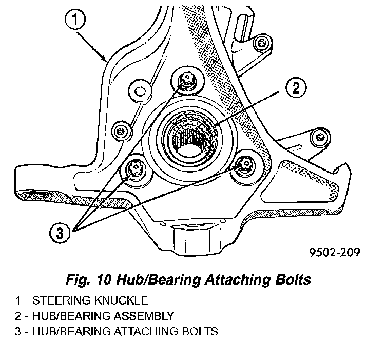 16. Remove the 3 bolts attaching the hub/bearing assembly to the steering knuckle.