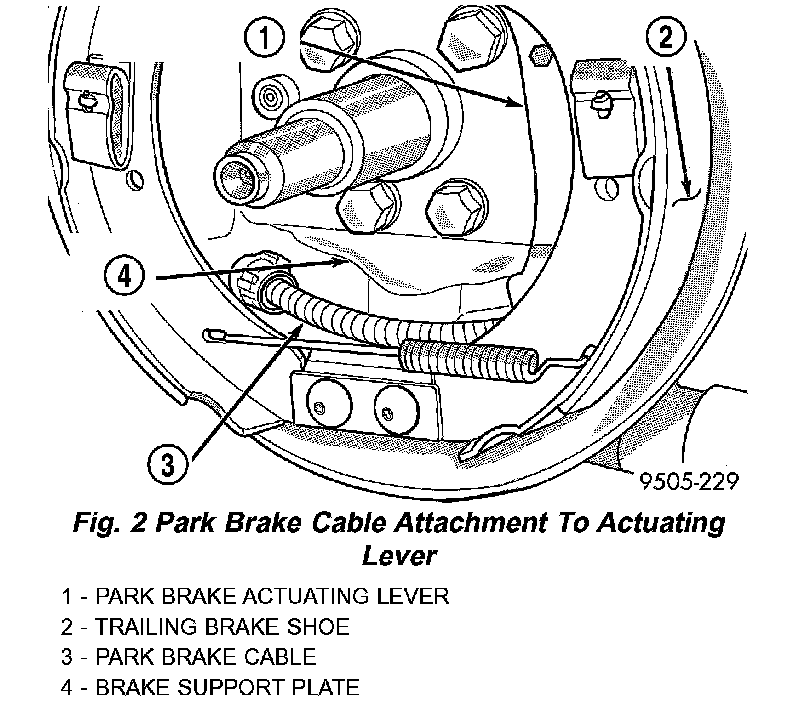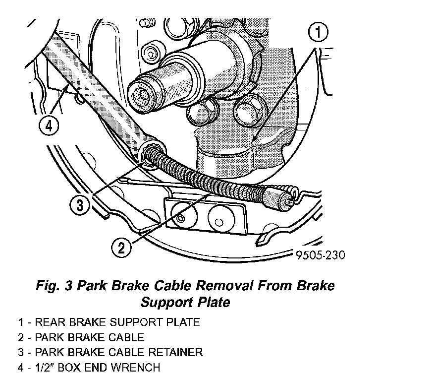 5. Remove the park brake cable from the park brake actuating lever. Then remove the park brake cable from the rear brake support plate. Park brake cable is removed from brake support plate using this procedure. Position a 1/2 inch box end wrench over cable retainer to collapse retaining tabs. Then pull bare brake cable from brake support plate.