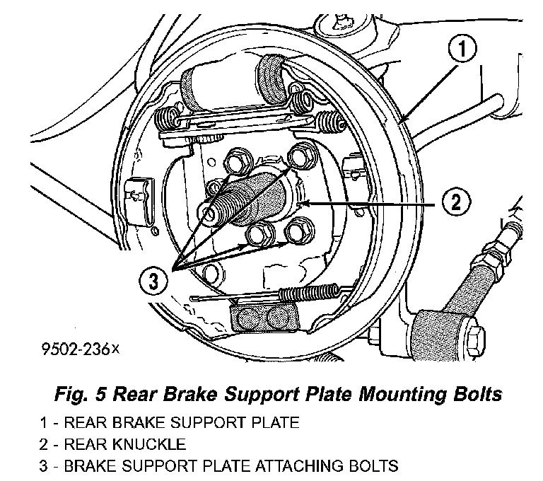5. Install rear brake support plate assembly onto the knuckle. Install the 4 bolts attaching rear brake support plate to rear knuckle. Tighten the attaching bolts to a torque of 61 Nm (45 ft. lbs.).