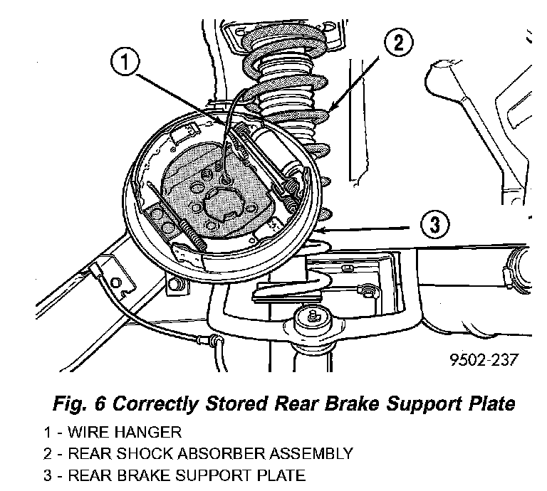 7. Remove the 4 bolts attaching rear brake support plate to knuckle. Then remove brake support plate, brake shoes and wheel cylinder as an assembly from rear knuckle. It is not necessary to remove brake flex hose from wheel cylinder when removing support plate. Brake support plate when removed, must be supported using mechanics wire as shown in the image.
