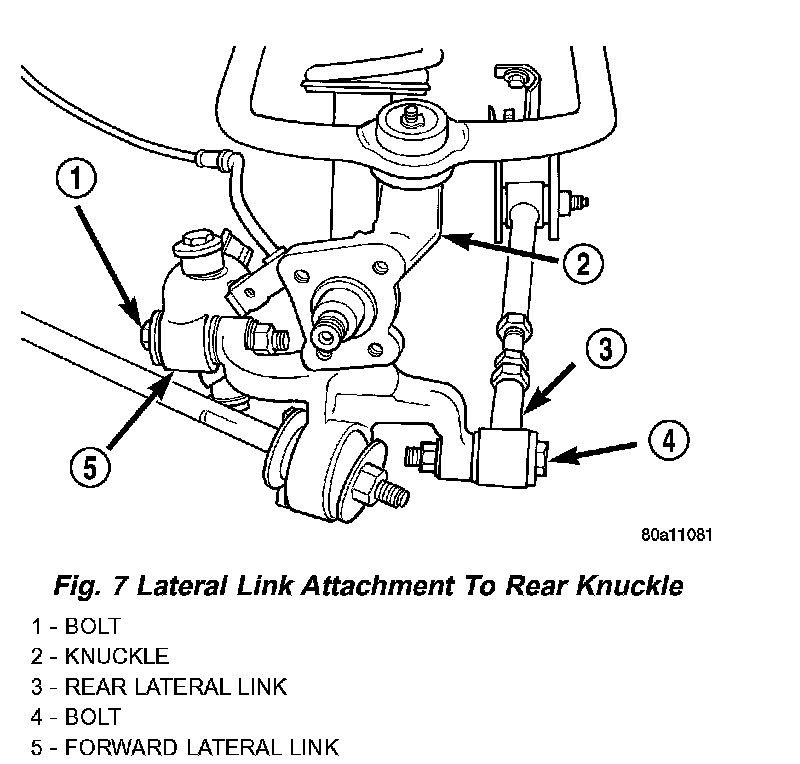 4. Install the front and rear lateral links and attaching nuts and bolts on the knuckle. Tighten the lateral links to knuckle attaching bolts and nuts to 108 Nm (80 ft. lbs.).