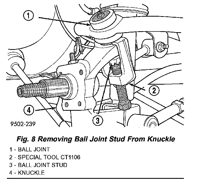 10. Release ball joint stud from knuckle using Puller, Special Tool, CT-1106.