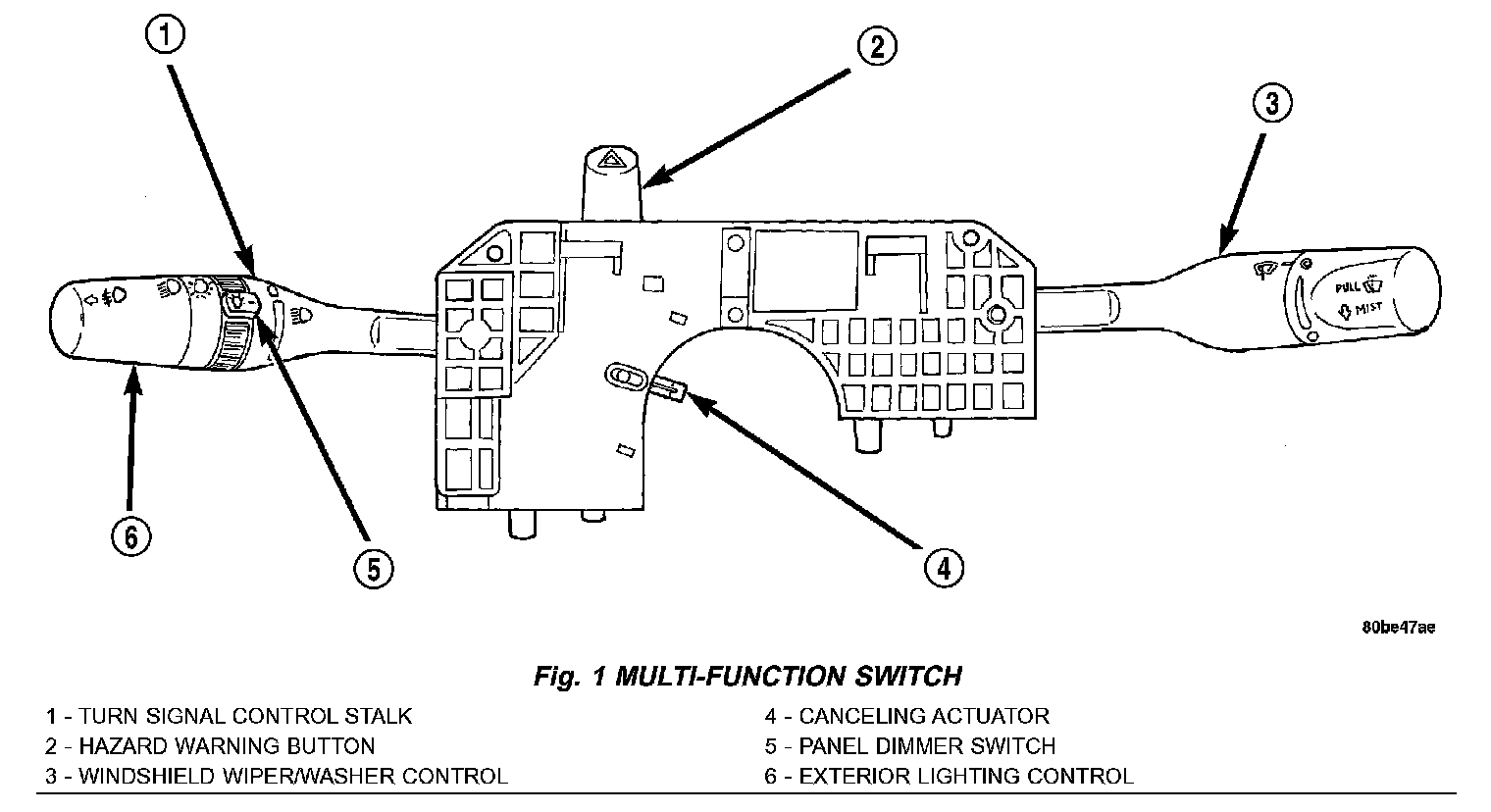 This vehicle is equipped with an electrically operated windshield washer pump. The washers are operated by a switch in the multi-function switch control lever. The lever is located on the right side of the steering column.