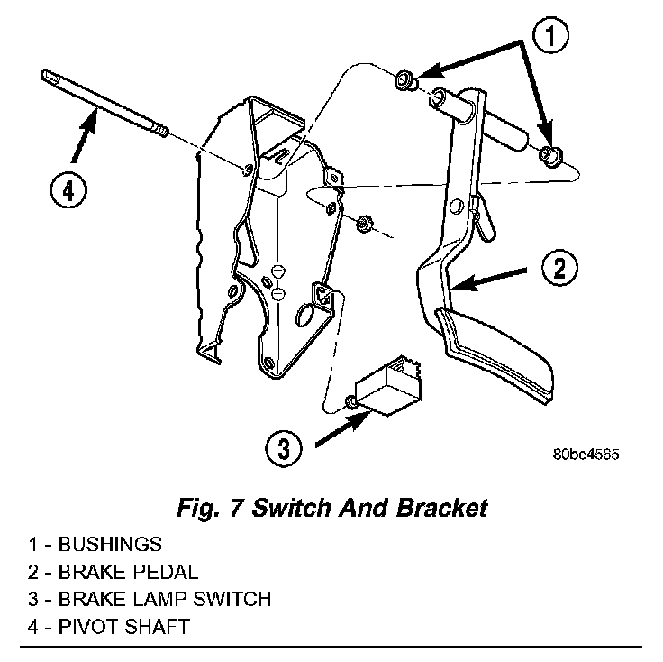 1. Remove the brake lamp switch from its bracket. The brake lamp switch is removed by depressing and holding the brake pedal while rotating brake lamp switch in a counter-clockwise direction approximately 30 degrees. Pull the switch rearward and remove it from its mounting bracket.