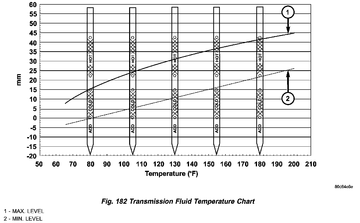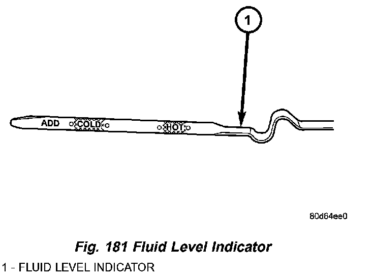 The torque converter fills in both the P Park and N Neutral positions. Place the selector lever in P Park to be sure that the fluid level check is accurate. The engine should be running at idle speed for at least one minute, with the vehicle on level ground. At normal operating temperature 82 °C (180 °F), the fluid level is correct if it is in the HOT region on the oil level indicator (Fig. 181). The fluid level should be within the COLD region of the dipstick at 27 °C (80 °F) fluid temperature.