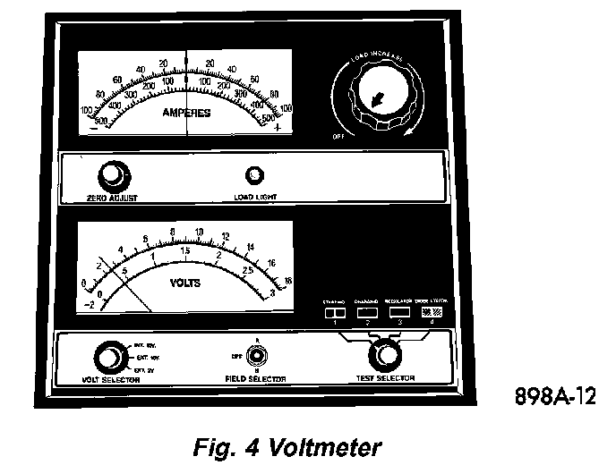 1. Measure the voltage at the battery posts with a voltmeter, accurate to 1/10 (0.10) volt (Fig. 4). If the reading is below ten volts, the battery charging current will be low. It could take some time before the battery accepts a current greater than a few milliamperes. Such low current may not be detectable on the ammeters built into many battery chargers.