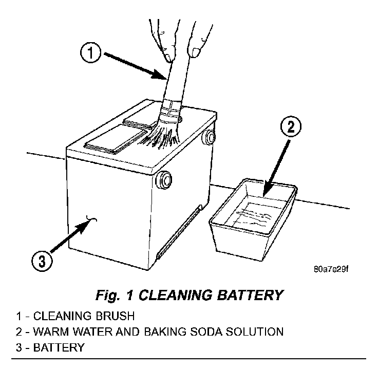 3. If the removed battery is to be reinstalled, clean the outside of the battery case and the top cover with a sodium bicarbonate (baking soda) and warm water cleaning solution using a stiff bristle parts cleaning brush to remove any acid film (Fig. 1). Rinse the battery with clean water. Ensure that the cleaning solution does not enter the battery cells through the vent holes. If the battery is being replaced, refer to Battery System Specifications for the factory-installed battery specifications. Confirm that the replacement battery is the correct size and has the correct ratings for the vehicle.