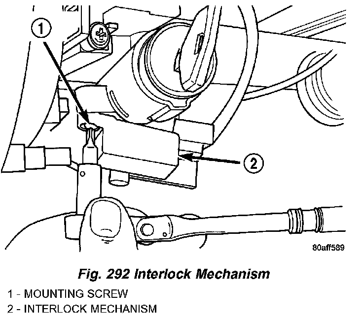 1. Position the interlock housing at steering column. Install the two interlock mechanism to steering column attaching screws (Fig. 292). Torque screws to 3 Nm (21 in. lbs.).