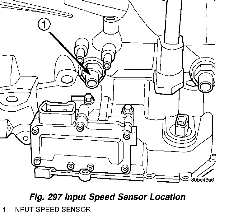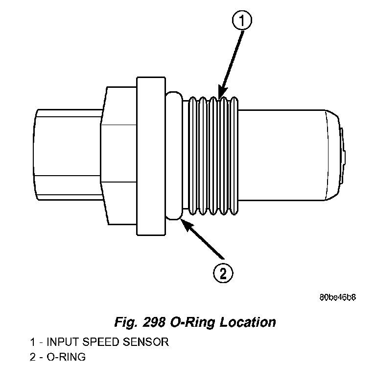DESCRIPTIONThe Input Speed Sensor is a two-wire magnetic pickup device that generates AC signals as rotation occurs. It is threaded into the transaxle case (Fig. 297), sealed with an O-ring (Fig. 298), and is considered a primary input to the Transmission Control Module (TCM).
