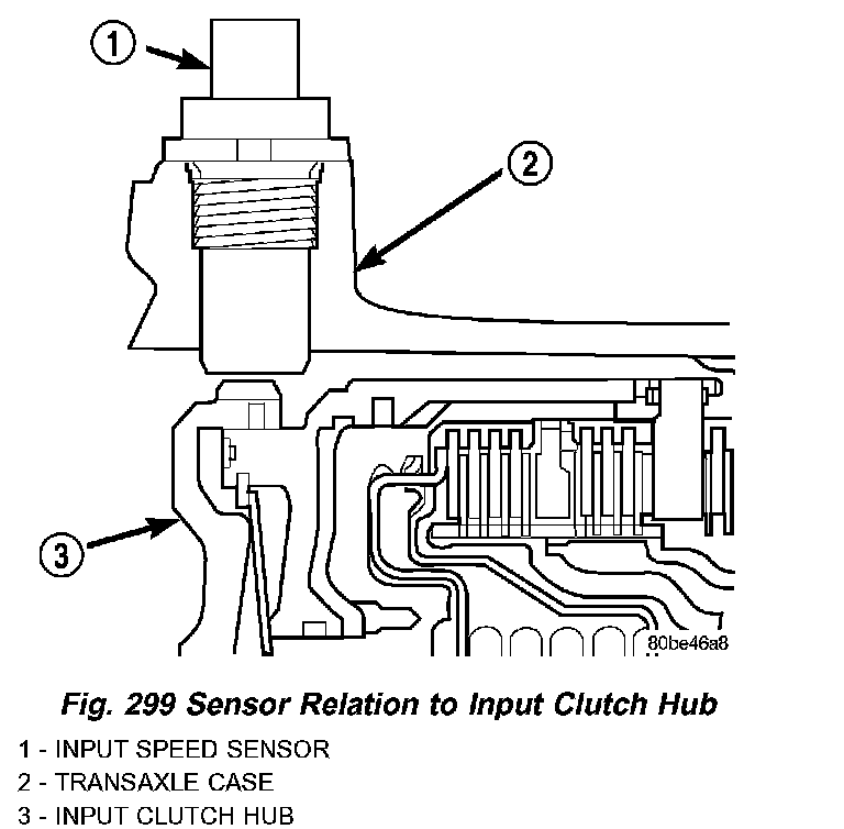The Input Speed Sensor provides information on how fast the input shaft is rotating. As the teeth of the input clutch hub pass by the sensor coil (Fig. 299), an AC voltage is generated and sent to the TCM. The TCM interprets this information as input shaft rpm.