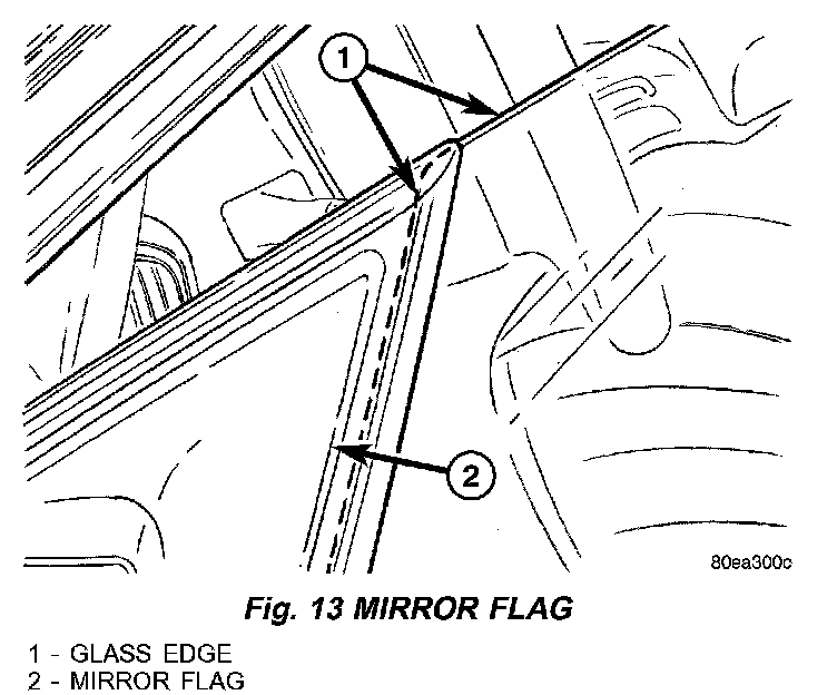 NOTE: Verify that the forward edge of the glass is flush with the mirror flag edge. Adjust the mirror flag as necessary to achieve a flush condition. (Fig. 13).