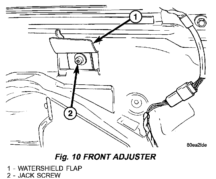 3. Remove watershield as necessary to gain access to the rear adjuster. Lifting up the flap in the water-shield can access the front adjuster. (Fig. 10).