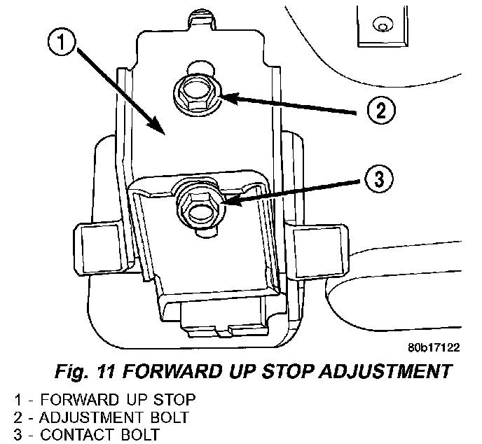 10. Verify that the forward up stop fully contacts hook on glass. Adjust contact bolt on the forward up stop as necessary.