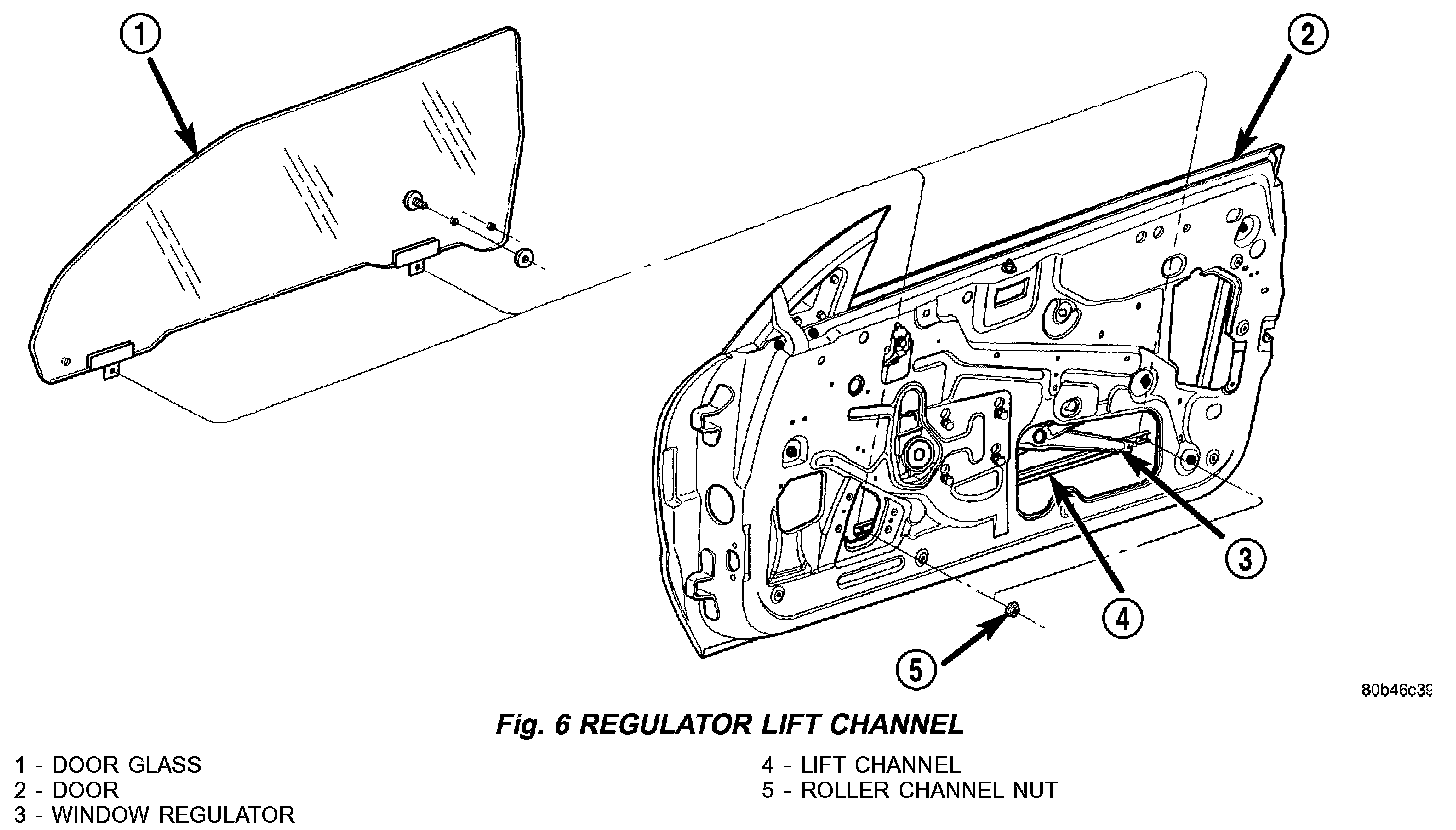 6. Remove bolts attaching regulator lift channel to door glass (Fig. 6).