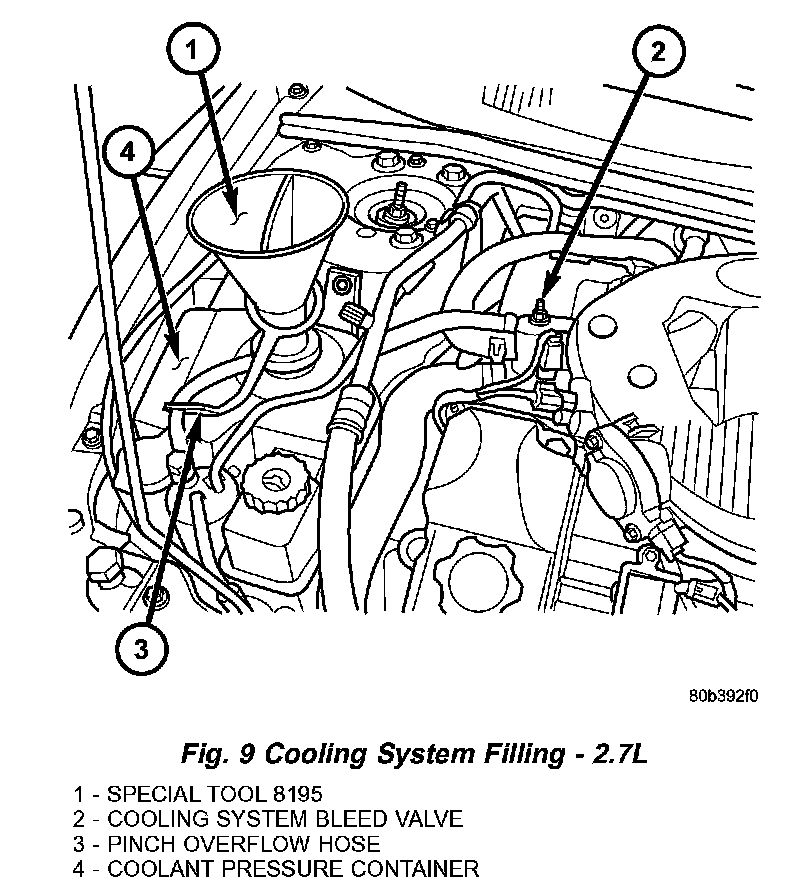 COOLING SYSTEM FILLING - 2.7LCAUTION: Do not use well water or suspect water supply in cooling system. A 50/50 mixture of the recommended ethylene glycol and distilled water is recommended.