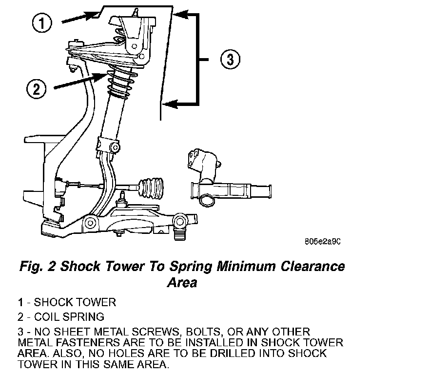 CAUTION: At no time when servicing a vehicle, can a sheet metal screw, bolt or other metal fastener be installed in the shock tower to take the place of an original plastic clip. Also, NO holes can be drilled into the front shock tower in the area shown in, for the installation of any metal fasteners into the shock tower. Because of the minimum clearance in this area installation of metal fasteners could damage the coil spring coating and lead to a corrosion failure of the spring.