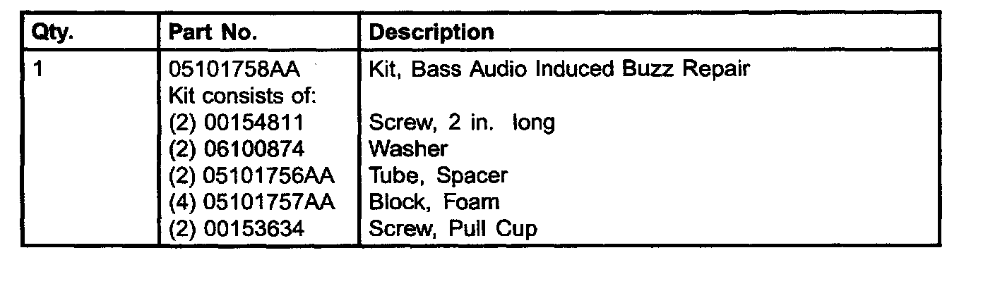 This bulletin involves installing two foam blocks, a screw, washer and tube behind the front door speaker grille, checking the torque on the door trim and speaker fasteners, replacing the door pull cup screw as well as cutting a small hole in the water shield on both doors.