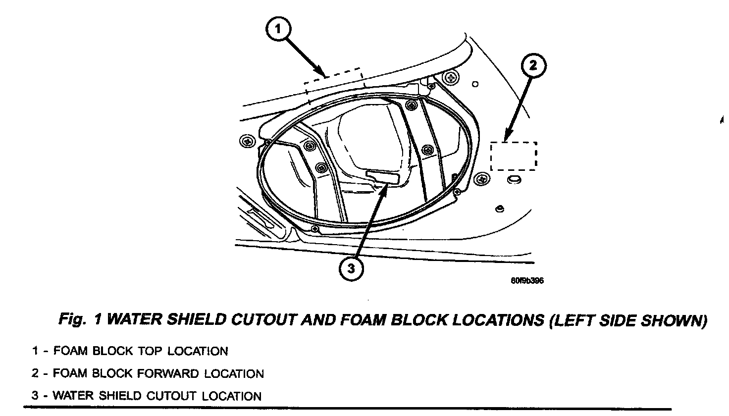 4. Install a foam block so the 2 in. thickness is between the door trim panel and the water shield at the front of the speaker opening, (Fig. 1) Item 2. Position the block so its bottom edge is horizontal and above the speaker locator hole as well as forward of the speaker mounting bracket screw boss