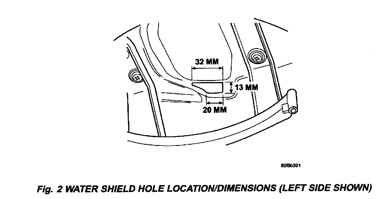 5. Referring to (Fig. 2) use a sharp knife to cut an opening in the water shield. Be careful to make sure the opening does NOT extend past the horizontal area of the water shield surface, otherwise water may leak into the passenger compartment.