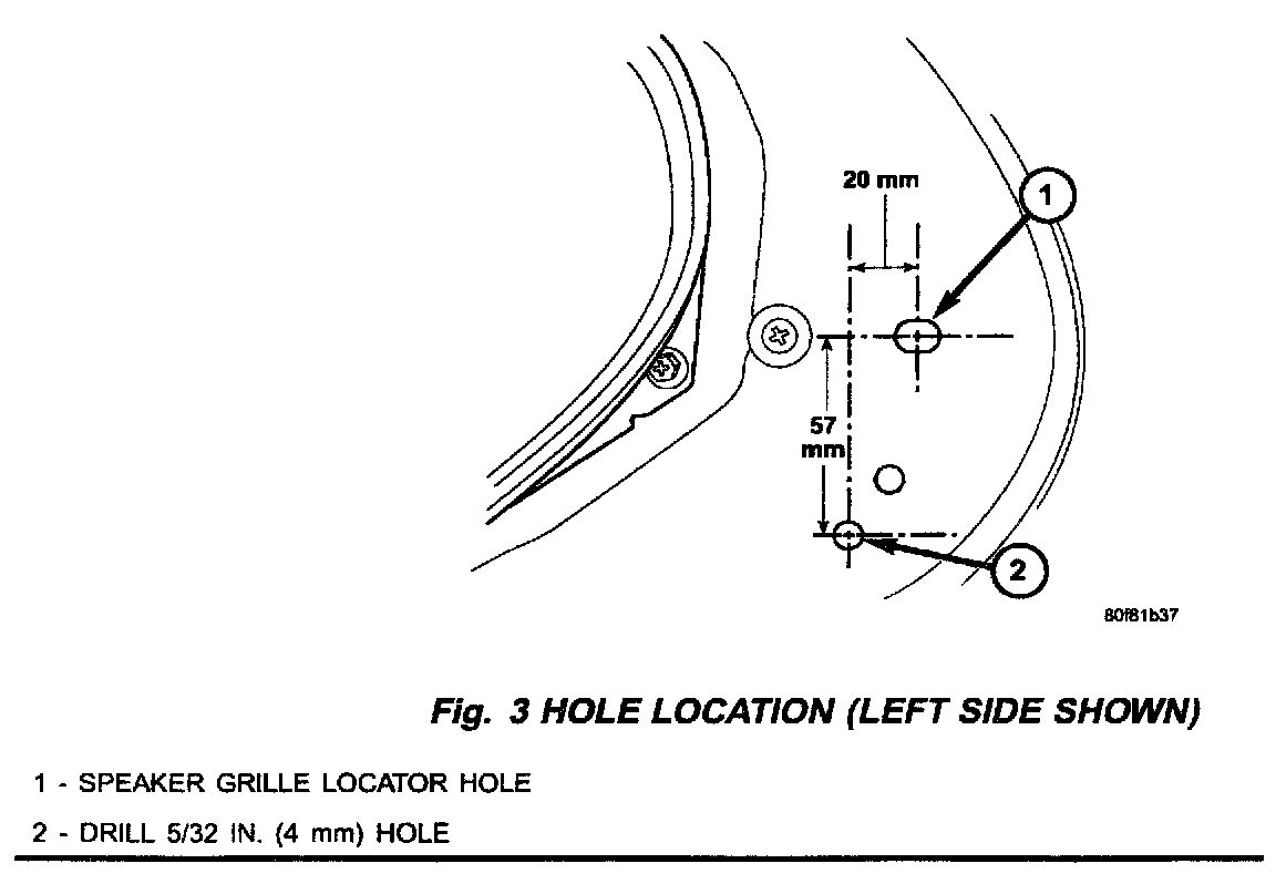 10. Referring to (Fig. 3), measure from the speaker grille locator hole, 20 mm rearward and 57 mm downward, and place a mark.
