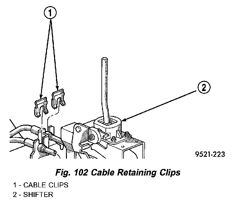 6. Remove crossover and selector cable retaining clips (Fig. 102) from mechanism and disconnect cables.
