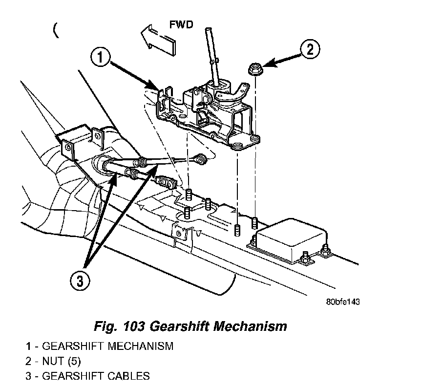 1. Install gear shift mechanism to floor pan (Fig. 103). Install and torque four (4)nuts to 25 Nm (18 ft. lbs.).