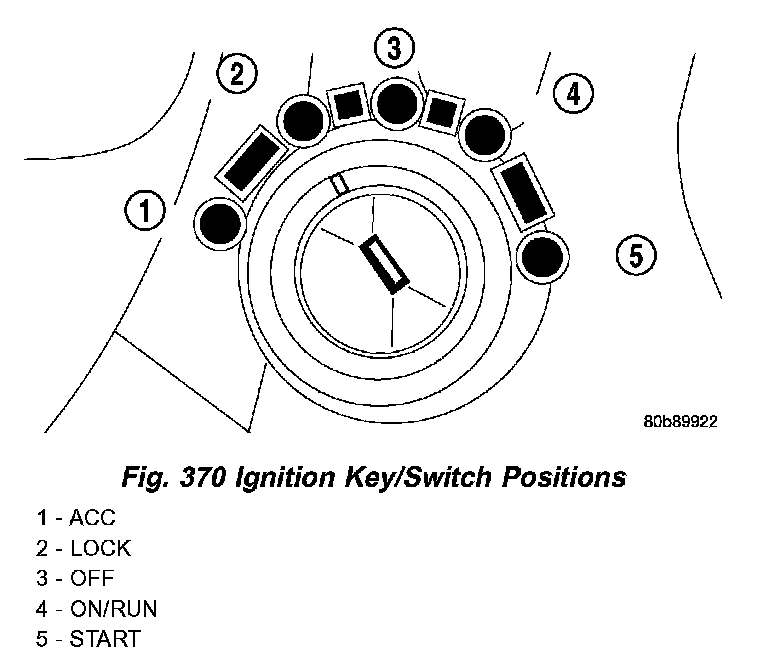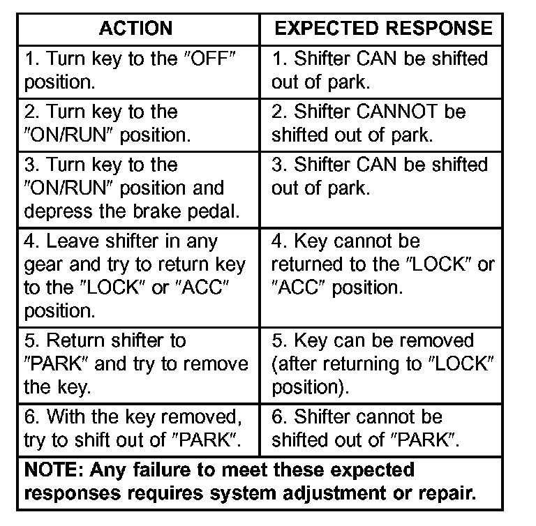 Refer to the chart that expected shifter response, depending on ignition key/switch (Fig. 370) and brake pedal positions.