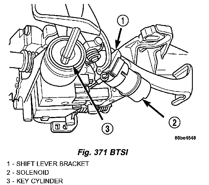 Vehicles equipped with a column shifter utilize a Brake Transmission Shift Interlock (BTSI) solenoid, which prevents the transmission gear shifter from being moved out of PARK without a driver in place (Fig. 371).