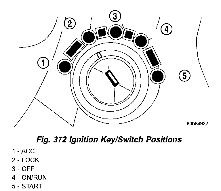 The Brake Transmission Shifter/Ignition Interlock (BTSI) is engaged whenever the ignition switch is in the LOCK or ACCESSORY position (Fig. 372). An additional electrically activated feature will prevent shifting out of the PARK position unless the brake pedal is depressed at least one-half inch. A magnetic holding device integral to the interlock cable is energized when the ignition is in the ON/RUN position. When the key is in the ON/RUN position and the brake pedal is depressed, the shifter is unlocked and will move into any position. The interlock system also prevents the ignition switch from being turned to the LOCK or ACCESSORY position, unless the shifter is in the gated PARK position.