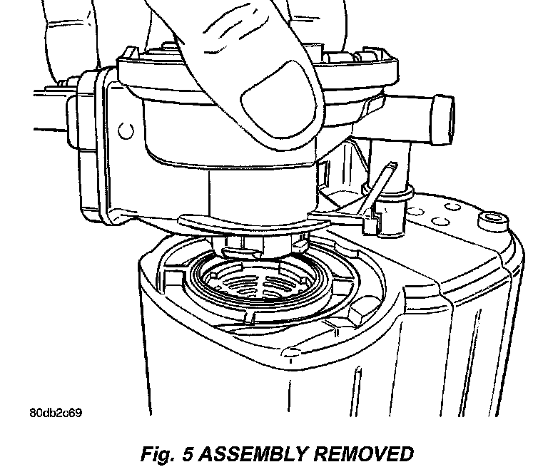 5. Lift tab on NVLD assembly and twist the assembly counterclockwise and pull up to remove from EVAP canister.
