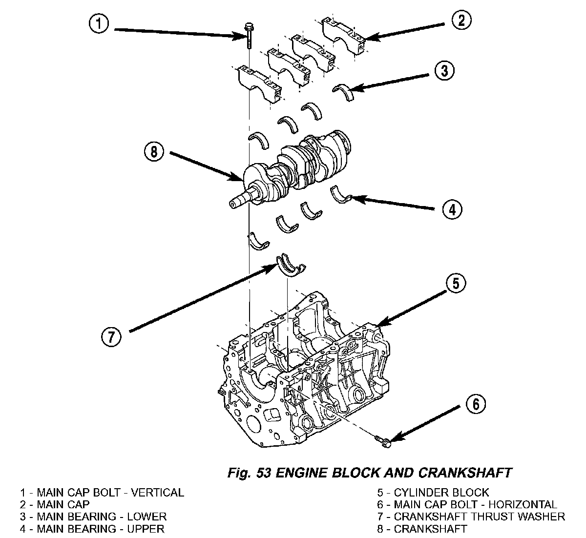 The cylinder block (Fig. 53) is made of heat treated aluminum with cast-in-place iron liners. The block is a closed deck design with the right bank forward. To provide high rigidity and improved NVH, the block has cast-in contours and ribs, along with powdered metal 6 bolt main caps (4 vertical, 2 horizontal), with a die cast aluminum structural beam windage tray mounted to the main caps.