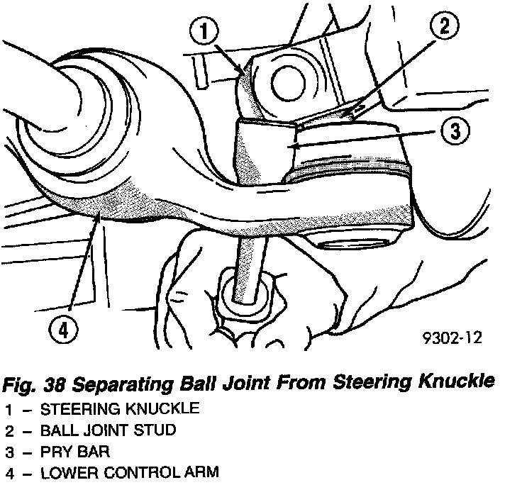 4. Carefully insert a pry bar between lower control arm and steering knuckle. Push down on pry bar to separate ball joint stud from steering knuckle.