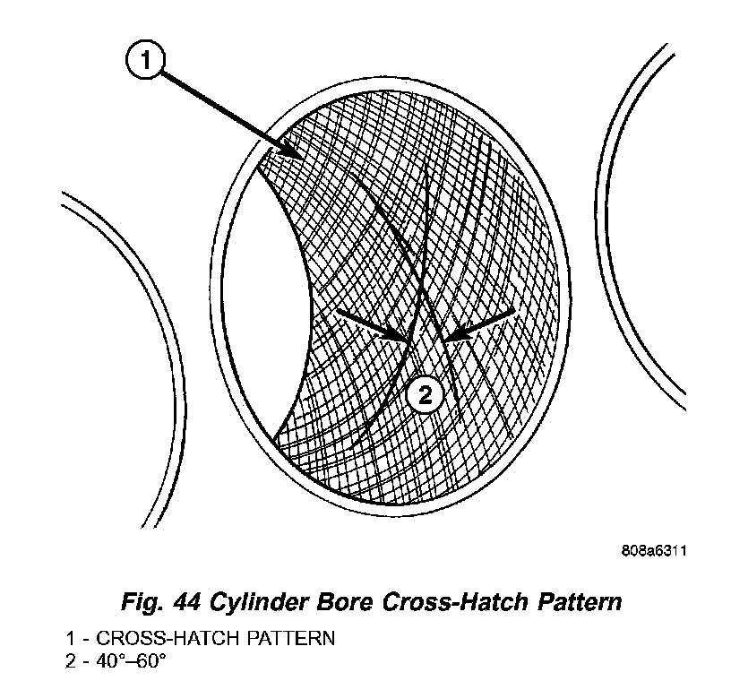 3. Honing should be done by moving the hone up and down fast enough to get a cross-hatch pattern. When hone marks intersect at 40-60 degrees, the cross hatch angle is most satisfactory for proper seating of rings (Fig. 44).