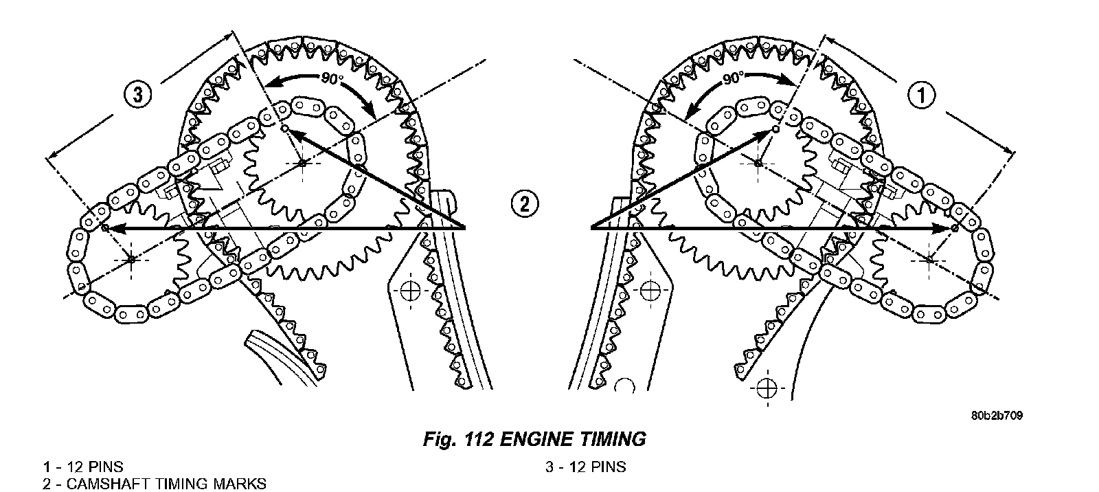 4. Count chain pins from the mark on the intake camshaft towards the exhaust camshaft. Engine is timed correctly when there are 12 chain pins between the timing marks on the intake camshaft and exhaust camshaft (Fig. 112).