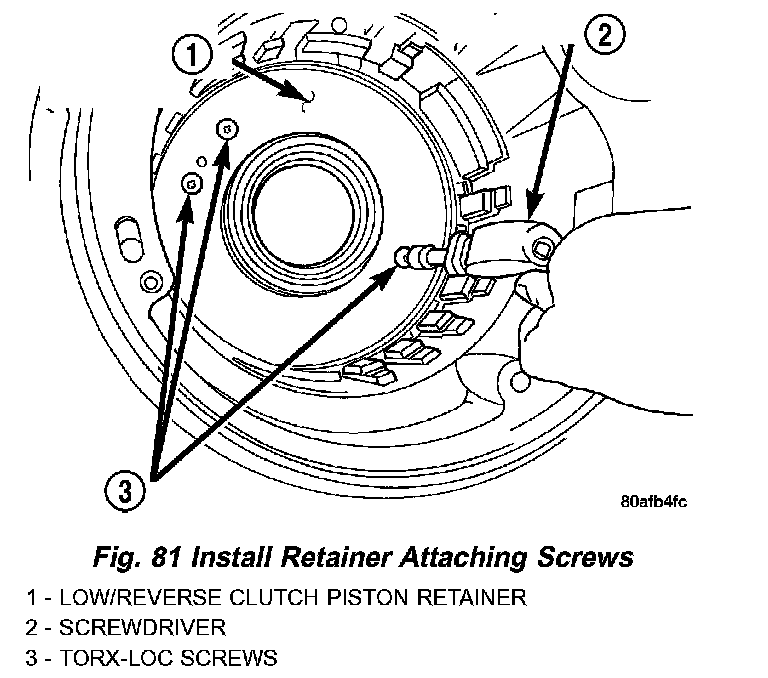 4. Install low/reverse piston retainer-to-case screws (Fig. 81) and torque to 5 Nm (45 inch lbs.).