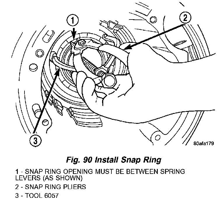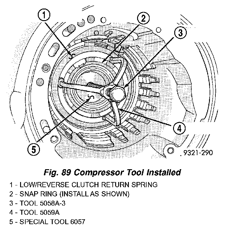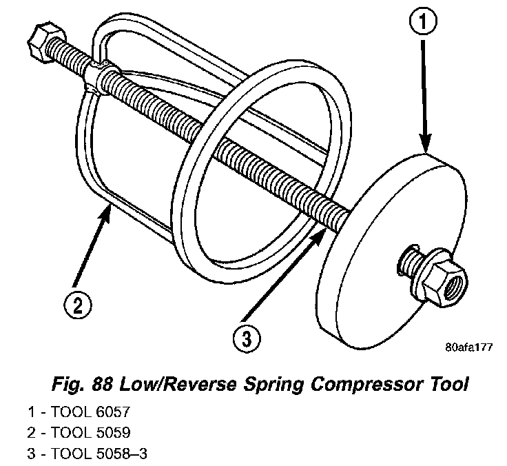 10. Install and load low/reverse spring compressor tool as shown in (Fig. 88) (Fig. 89) to facilitate snap ring installation.