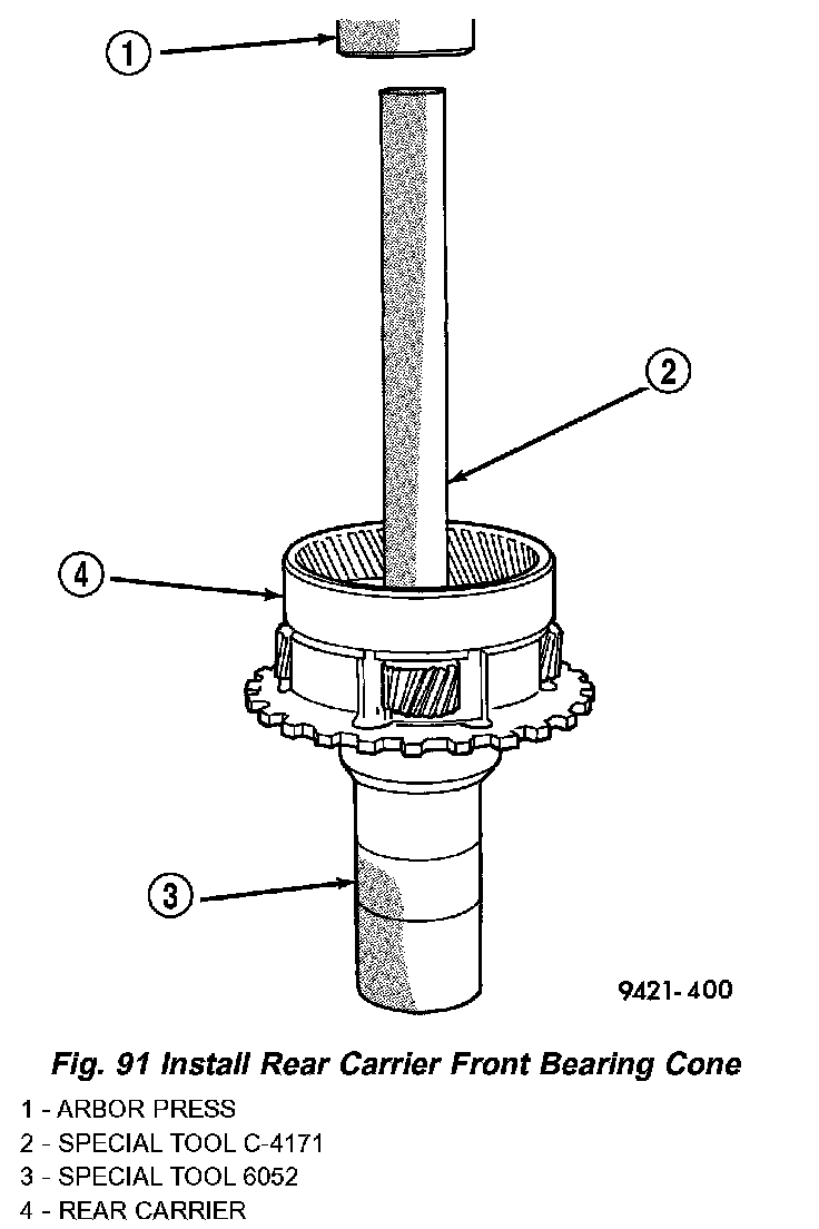 12. Install rear carrier front bearing cone (Fig. 91).