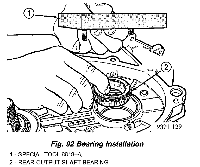 a. PRELOAD CHECK/SHIM SELECTION: Install rear output shaft bearing cone and special tool 6618A (Fig. 92).