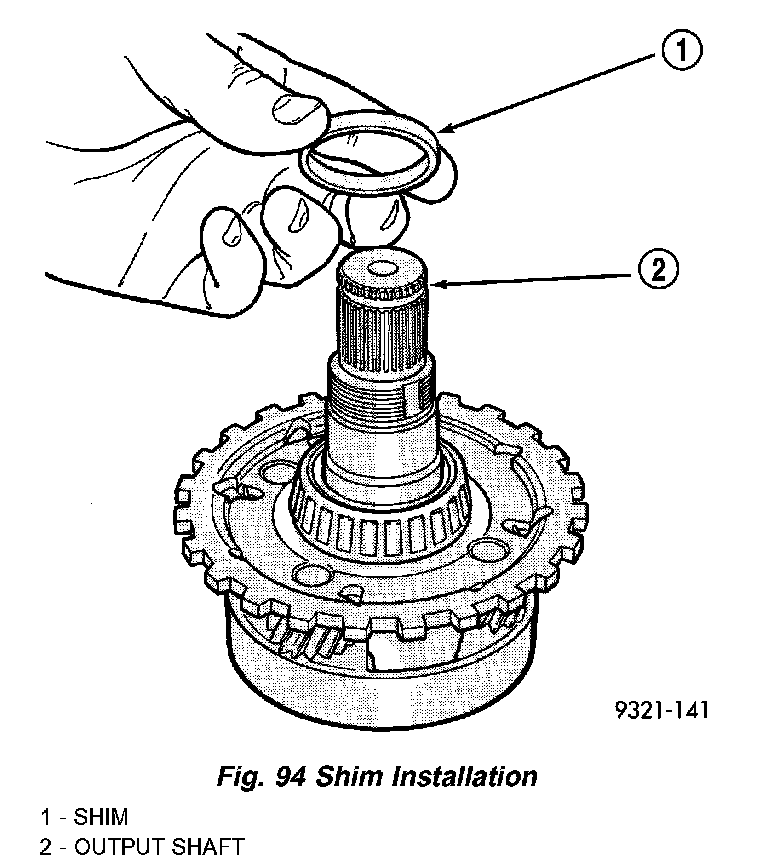 d. Install shim on output shaft (Fig. 94). Apply small amount of petrolatum onto the shim to hold it in place. Use the original shim as a starting point. If original shim is not available, use the thickest shim available. Refer to Output Shaft Rear Shim Chart for available sizes.