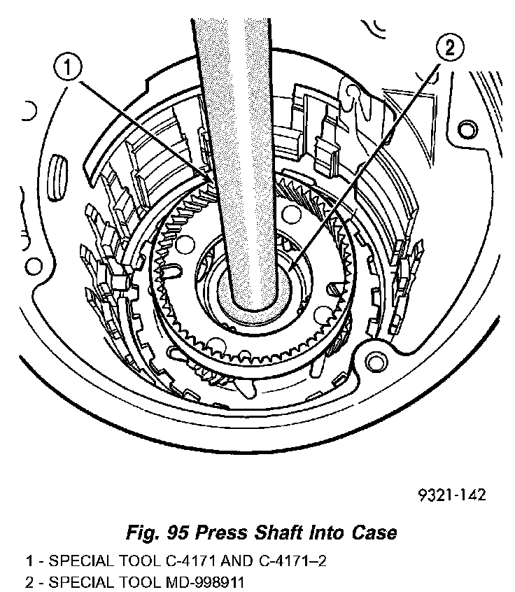 e. Install output shaft/rear carrier into rear bearing. The shaft must be pressed into position. Use special tool MD998911 (Disc) and C- 4171 and C4171-2 (Handle) to press shaft into rear bearing (Fig. 95).