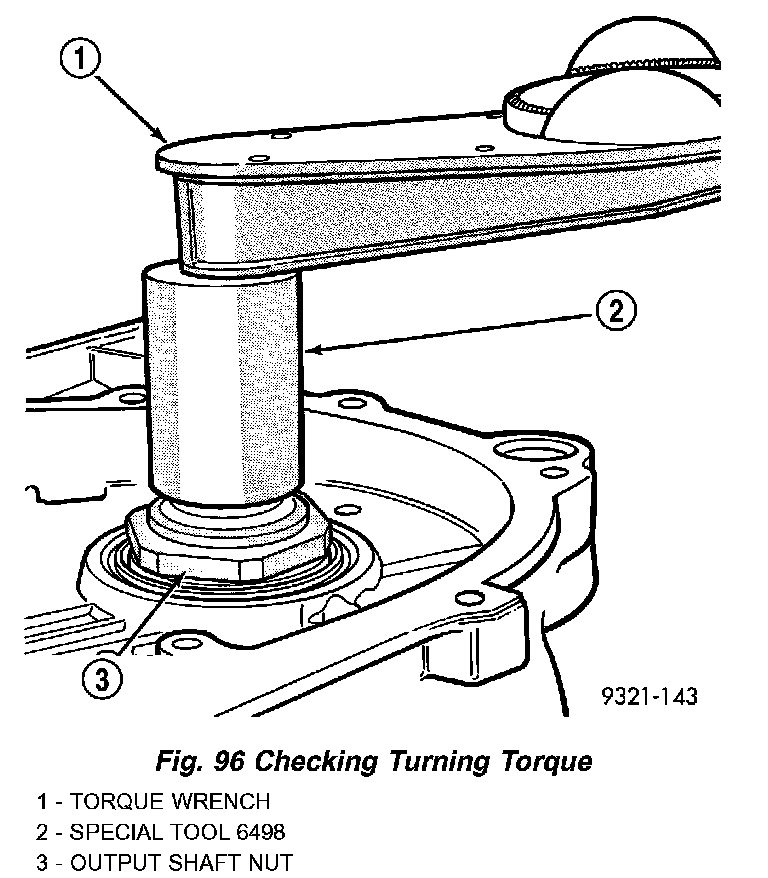 g. Check the turning torque of the output shaft (Fig. 96). The shaft should have 1 to 8 inch lbs. of turning torque. If the turning torque is higher than 8 inch lbs., install a thicker shim. If turning torque is less than 1 in. lb., install a thinner shim. Make sure there is no end play.
