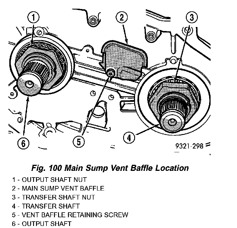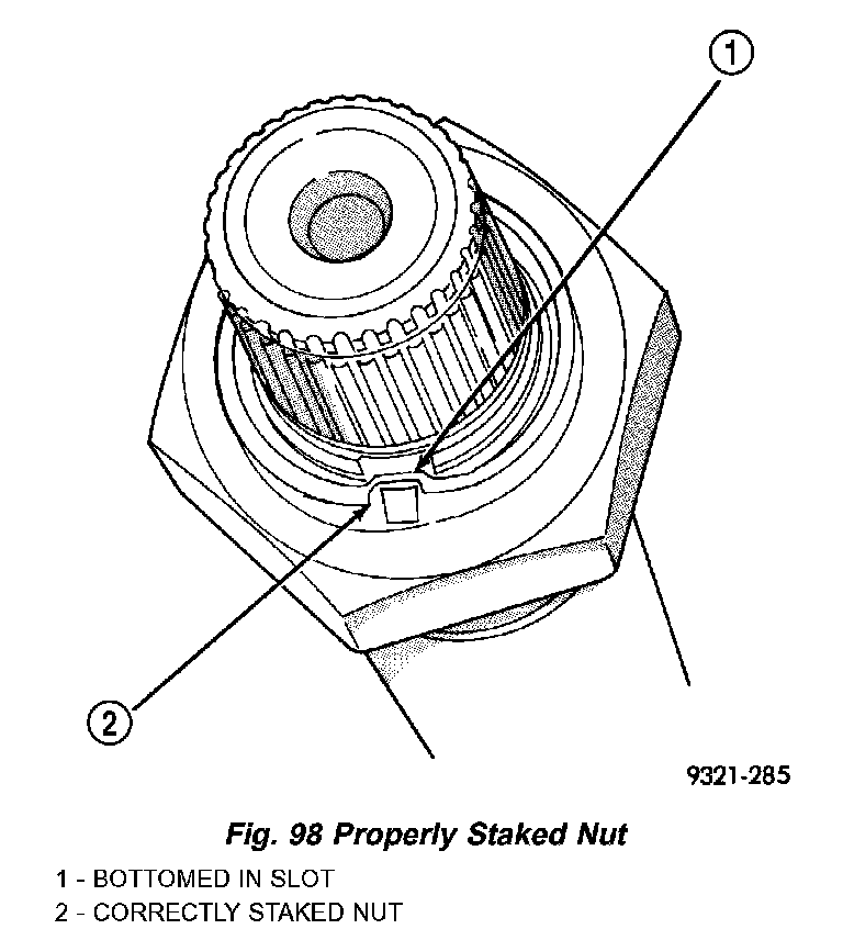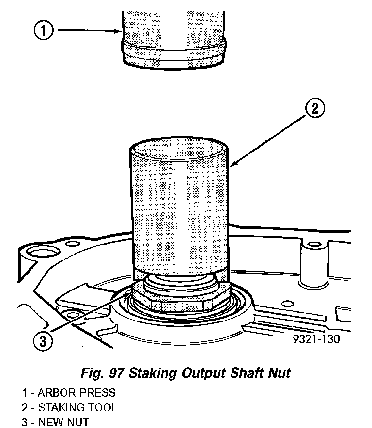 h. The new nut must be staked after the correct turning torque is obtained (Fig. 97) (Fig. 98). Use special tool 6639 to stake output shaft nut and special tool 6589 to stake transfer shaft.