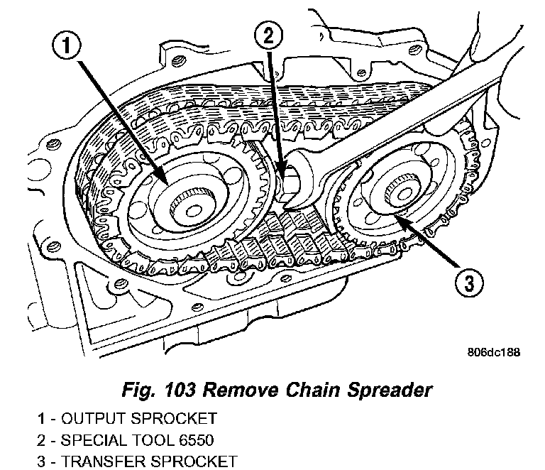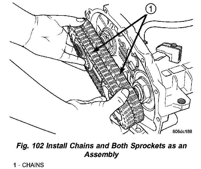 16. Install transfer chain and sprockets to transfer shaft and output shaft (Fig. 102).