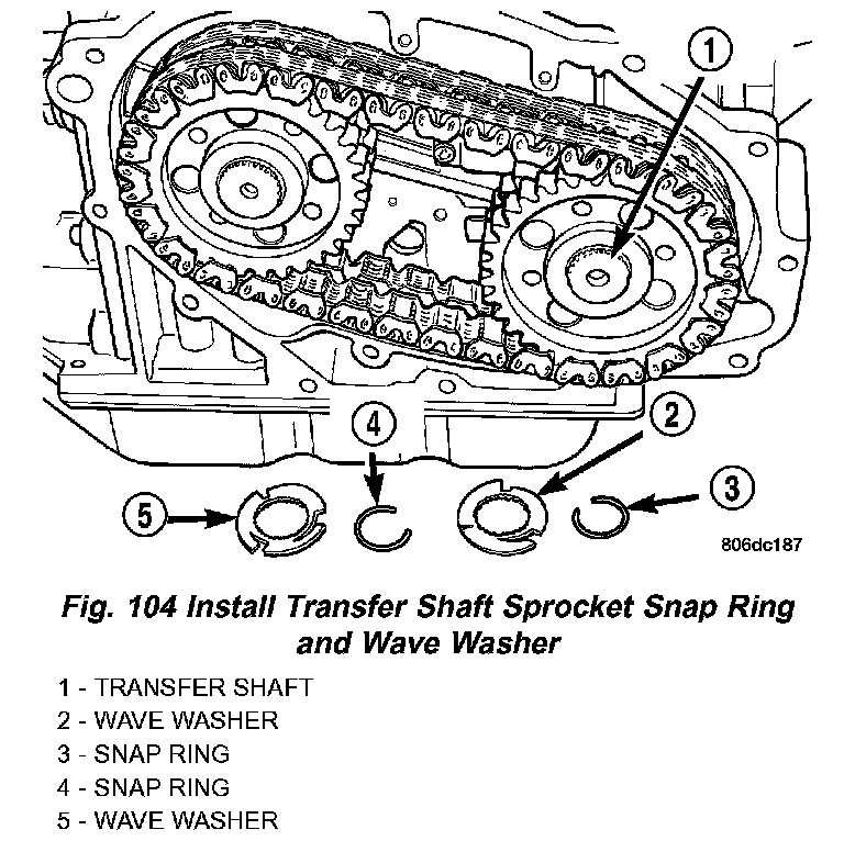 18. Install transfer shaft sprocket snap rings and wave washers (Fig. 104) (Fig. 105).