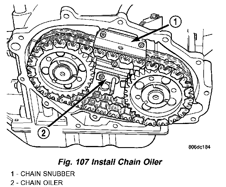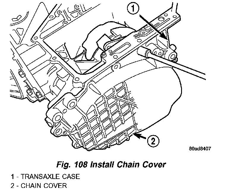 22. Install chain cover (Fig. 108). Chain cover must be free of old sealant, dirt and oil before applying new sealant. Apply a 1/8 inch bead of Mopar ATF RTV (MS-GF41) to flange of cover.