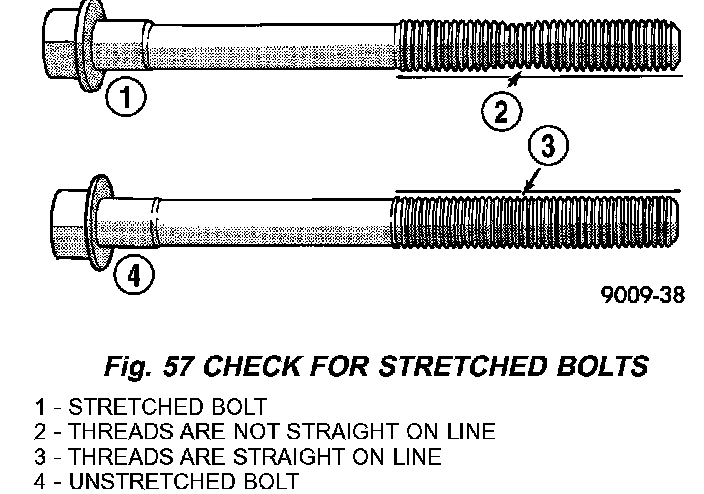 NOTE: The rod bearing bolts should be examined before reuse. If the threads are necked down the bolts must be replaced (Fig. 57).