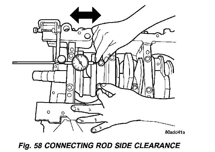 Mount a dial indicator to a stationary point on engine. Locate probe perpendicular to and resting against the connecting rod cap being checked. Move connecting rod all the way to rear of its travel. Zero the dial indicator. Move connecting rod forward to limit of travel and read the dial indicator (Fig. 58). Compare measurement to specification. Repeat procedure for each connecting rod. Turn crankshaft for connecting rod accessibility.