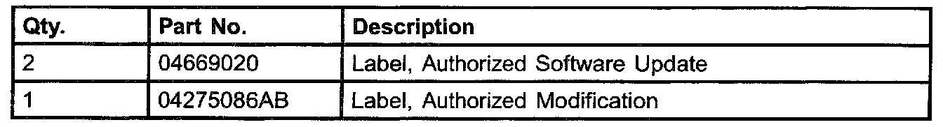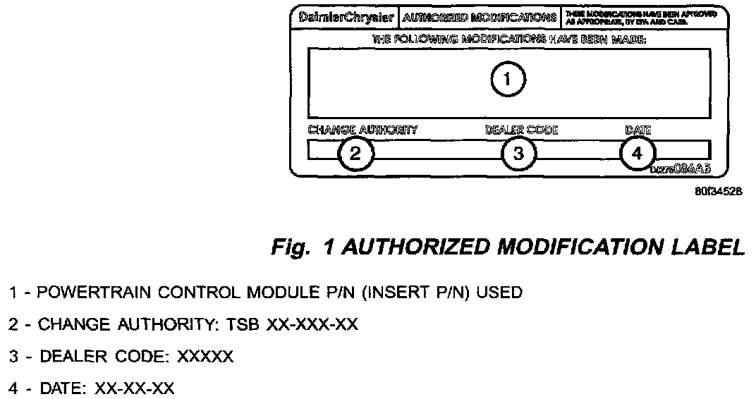 4. Type the necessary information on the "Authorized Modification Label" p/n 04275086AB and attach near the VECI label (Fig. 2).