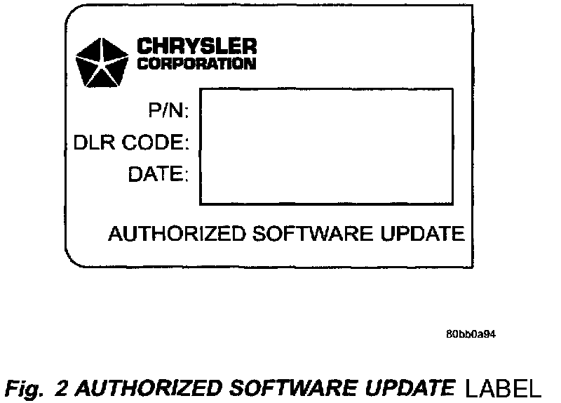 3. Type the necessary information on the Authorized Software Update Label" p/n 04669020 (Fig. 1). Attach the label to the PCM and/or TCM as necessary and cover the label(s) with the clear plastic overlay.